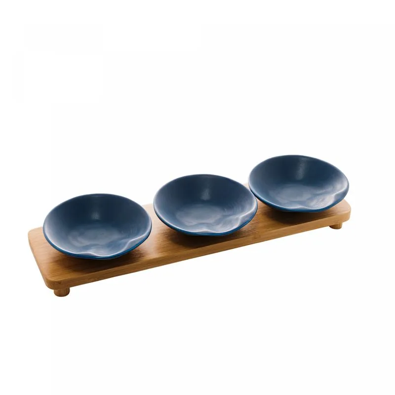Conjunto 3 Petisqueiras de Porcelana com Bandeja Bambu Azul Matt 32cm x 9cm x 5cm - Wolff
