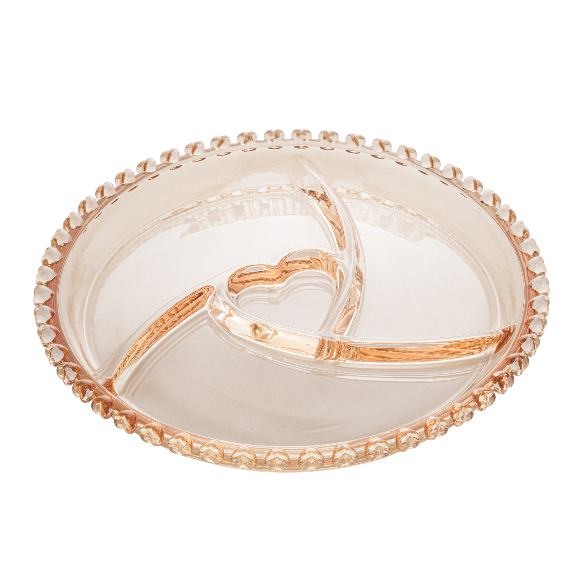 Fabricada em cristal transparente com um acabamento âmbar metalizado, a petisqueira destaca-se por sua beleza única e sofisticada.
